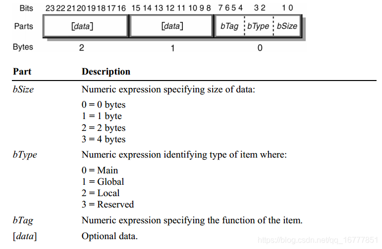 第十五行,15 80 其中0x15对应着Global类项的Logical Minimum项,数据共一个字节。数据80表示逻辑上最小为-128。