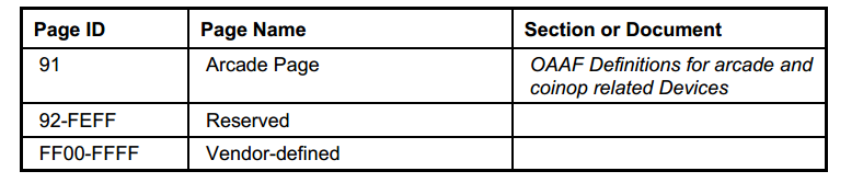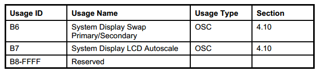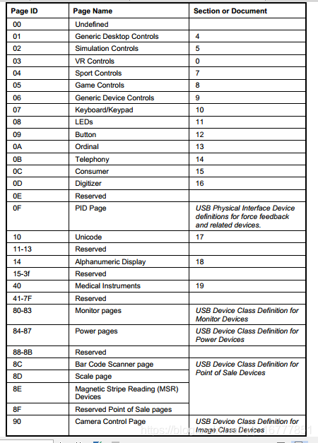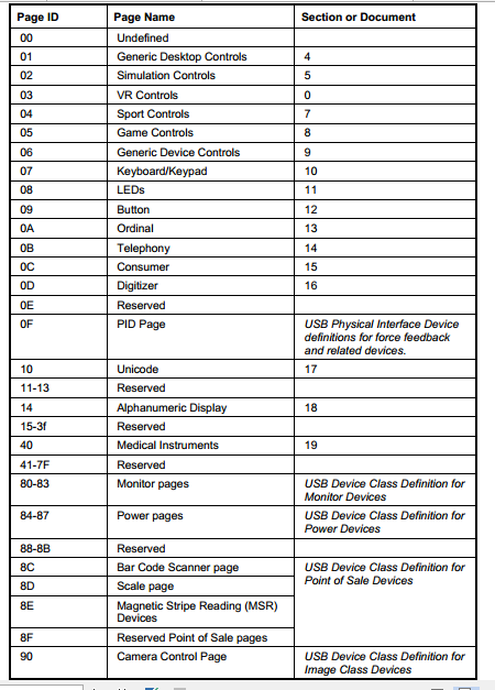 Usage page 项目的数据部分为 1~2 个字节,目前的定义全部都是一个字节。 Usage Page 定义了常用的设备功能,关于 Usage Page (以及其他项目)的具体定义内容,可以查阅 HID Usage tables ,下表是来自 HID Usage tables 的 Usage Page 定义。