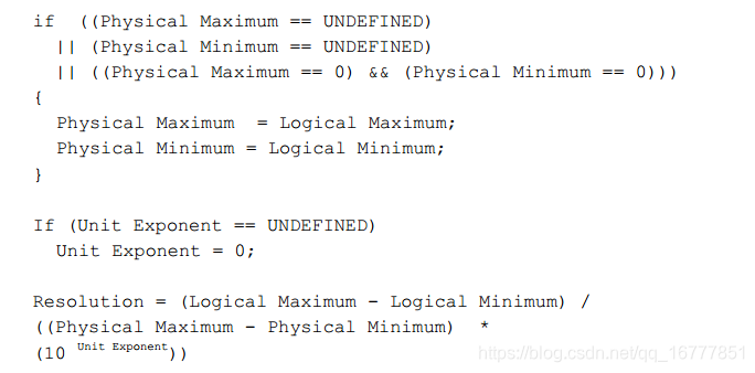 分辨率 = (LogicalMaximum - LogicalMinimum )÷((PhysicalMaximum - PhysicalMinimum )× 10^ UnitExponent )