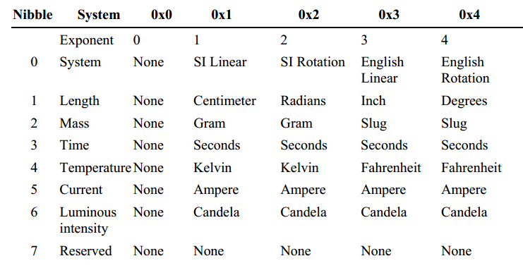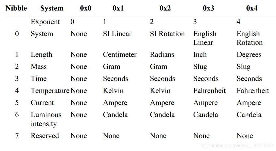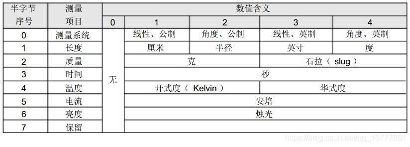 从半字节 0~6 由下表给出了具体的定义, 其中半字节 0 表示测量系统, 半字节 7 保留。例如在半字节 0 数值为 1(表示采用线性公制测量系统) 的条件下, 半字节 1 表示长度 (单位为厘米) ,如果其数值为 1 表示厘米,数值为 2 表示(厘米)^ 2,成为面积单位。半字节3 表示时间(单位为秒) ,如果其数值为 -2,表示(秒)^ -2。