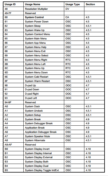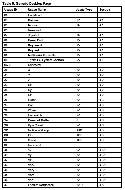 关于 Usage Page 的每一个有效定义项,都有一个相应的下一级定义,如 Usage Page的数据项数值为 1,则设备定义为 Generic Desktop Controls ,关于该类设备的具体功能可以在 HID Usage Tables 中查到具体的定义。下表是 HID Usage Tables 中对 Generic Desktop Controls 设备的功能定义