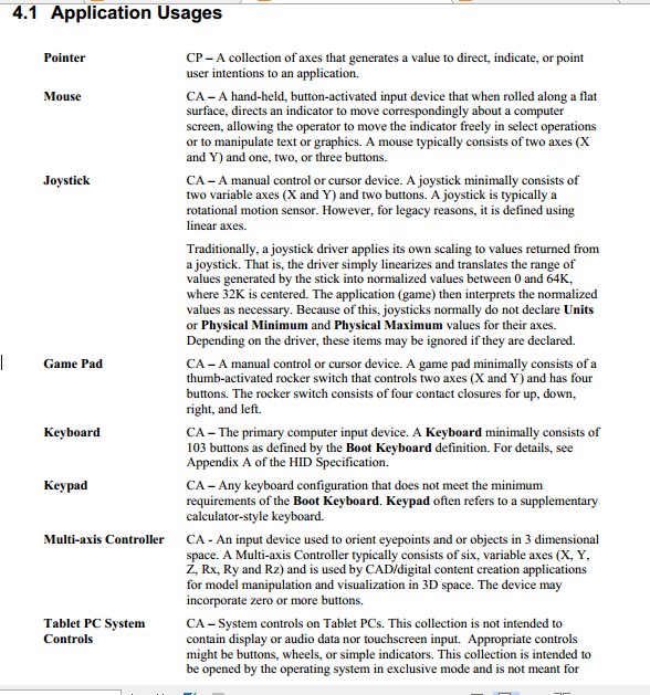 用法(Usage )定义了各种各样设备特性,对于Usage Page的每一项都定义了常用的各种用法。用法说明了3 种信息,即控制、集合和数据。控制说明设备的状态,如on/off 、Enable/Disable等。集合说明控制和数据的组合关系。上表中的用法类型(Usage Type )描述了应用程序如何处理由Main 类型项目生成的数据,具体的定义和详细说明请参阅HID Usage Tables。