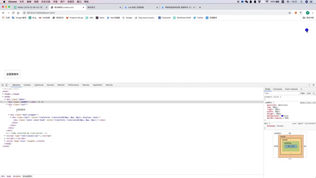 let rect = ball.el.getBoundingClientRect(); //拿到点击的“+”号的位置,这里不直接取值(我是用的绝对定位,当然可以直接取值)的原因是,商品列表中每个加号的位置是不固定的,如果上下滑动了,这个位置就不确定