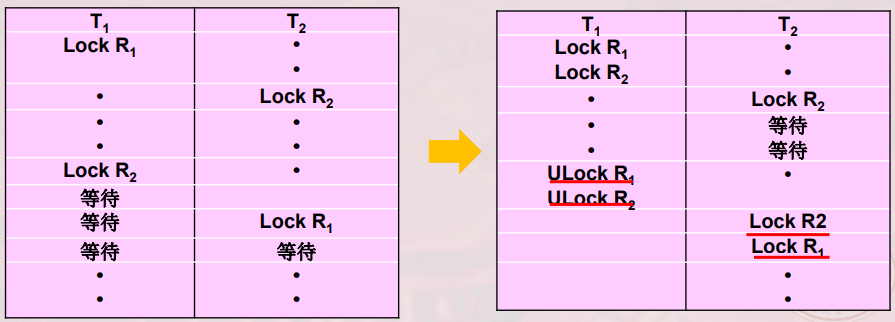 顺序封锁法:预先对数据对象规定一个封锁顺序(例如B+树从根节点开始逐层分锁),所有的事务都按照这个顺序施行封锁