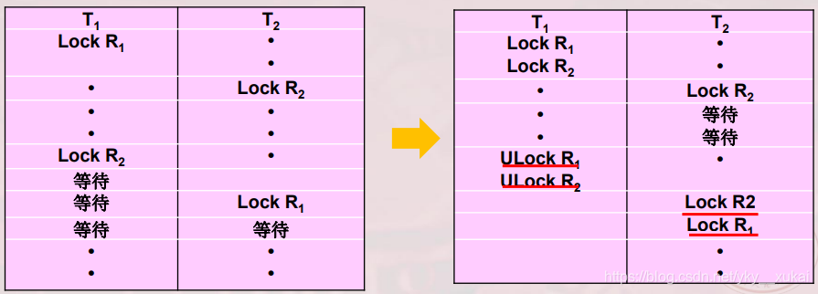 - 难以实现:事务的封锁请求可以随着事务的执行而动态的决定,很难事先确定每一个事务封锁哪些对象,因此就很难按照规定的顺序去施加封锁。