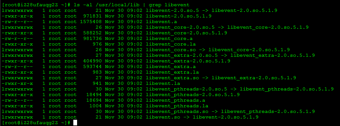 [root@localhost ~]# ls -al /usr/local/lib | grep libevent