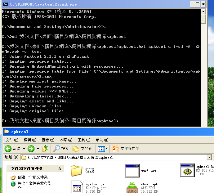 打开命令行界面(运行-CMD) ,定位到apktool文件夹,输入以下命令:apktool d [-s] -f test.apk -o test