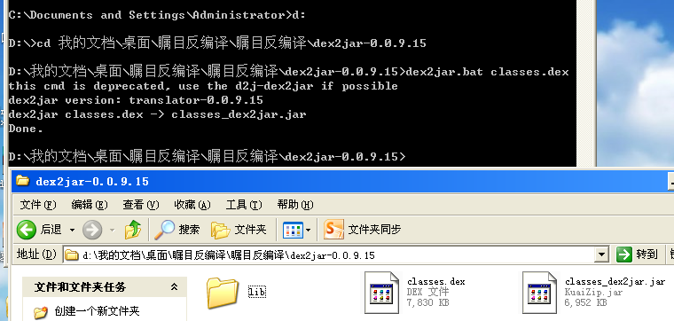 在命令行下定位到dex2jar.bat所在目录,输入dex2jar.bat classes.dex。效果如下: