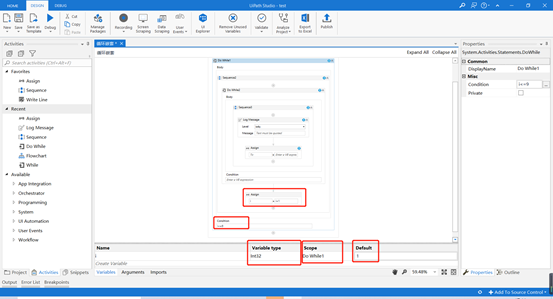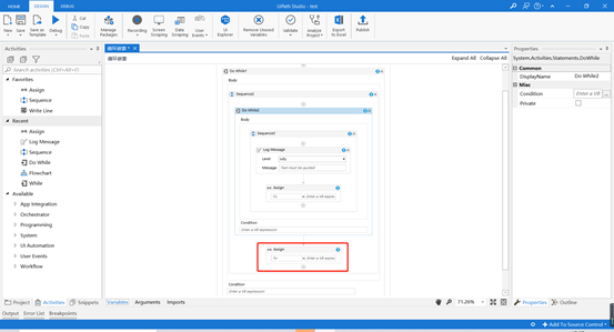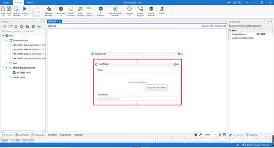 5. 在Activities中搜索While,并将Do While控件拖至设计区