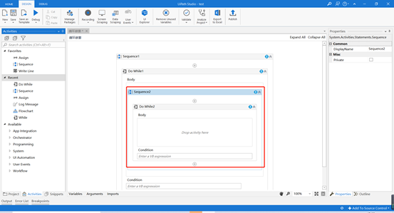 3.在Do While1的Body里添加一个Sequence,并在Sequence2中添加Do While循环