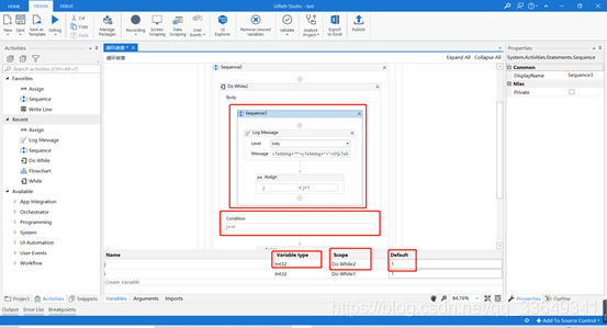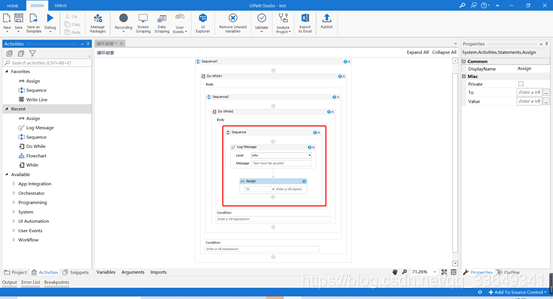 4.在添加的Do While2循环的Body里添加一个Sequence,并在Sequence3里添加一个Log Message用来打印信息,及添加一个Assign用来设置变量及变量增长表达式