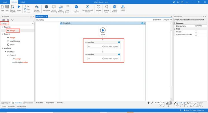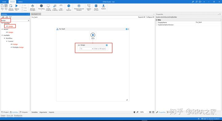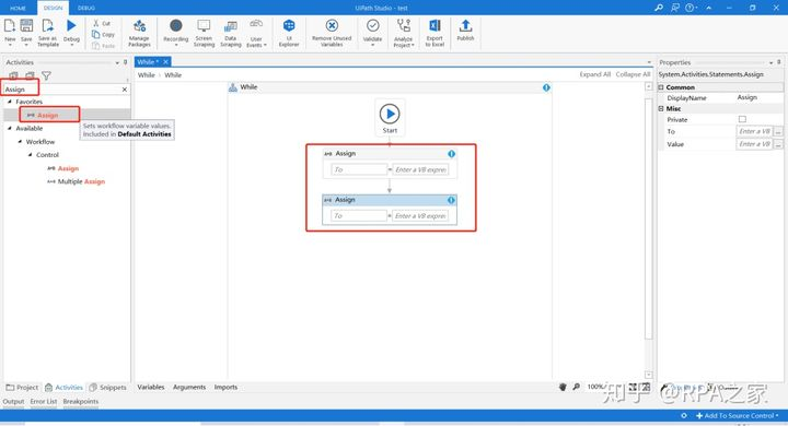 3. 在Activities中搜索Assign,添加两个Assign控件到设计区