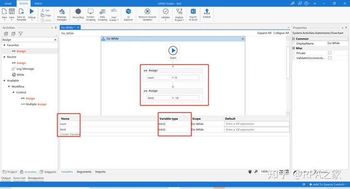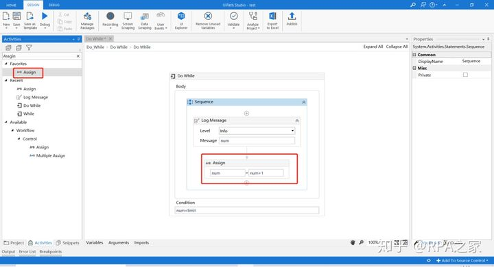 7. 在DoWhile控件的Body中添加Assign控件,填写num变量每次循环+1的表达式,并在Do While控件中的Condition填写判断表达式