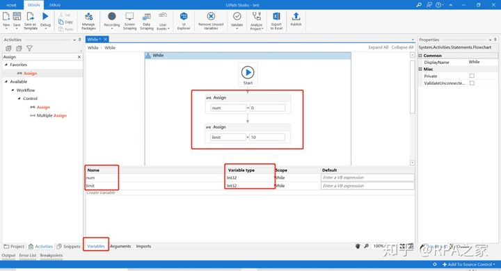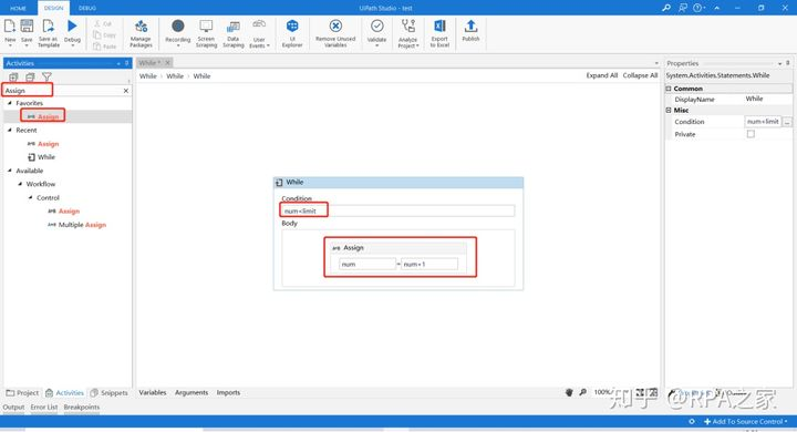 6. 在While控件中的Condition填写判断表达式,并在While控件的Body中添加Assign控件,填写num变量每次循环+1的表达式