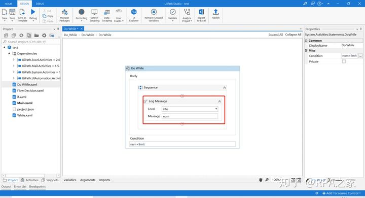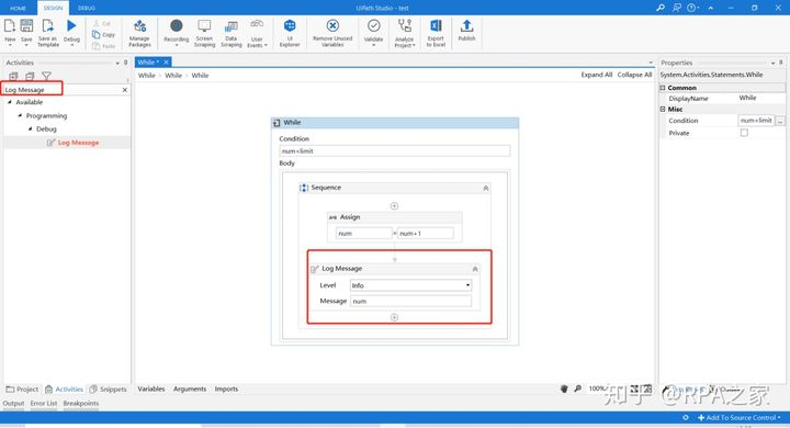 6. 在Do While控件的Body中添加Log Message用来打印num的值