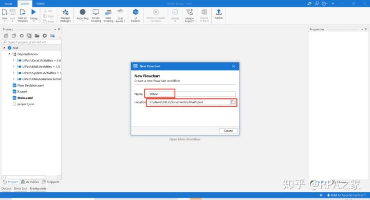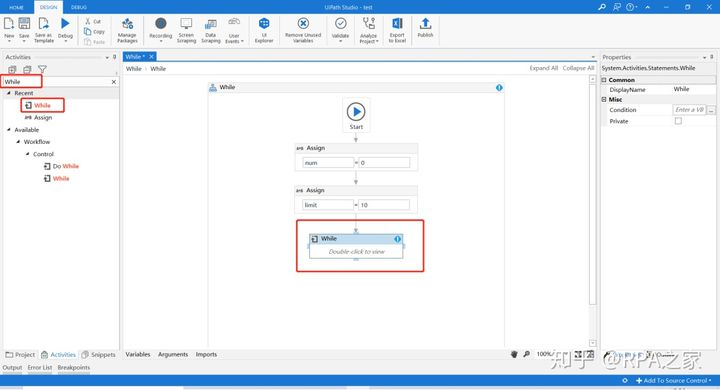 5. 在Activities中搜索While,并将While控件拖至设计区