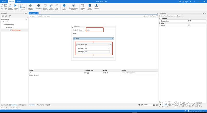 6.在For Each控件里填写传入变量值,并添加Log Message控件用来打印List