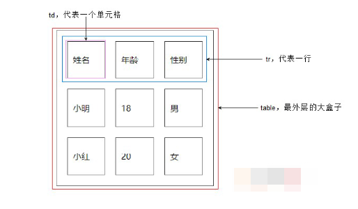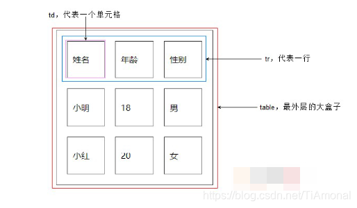 | <table | 表格标签 | 就是一个四方的盒子 |