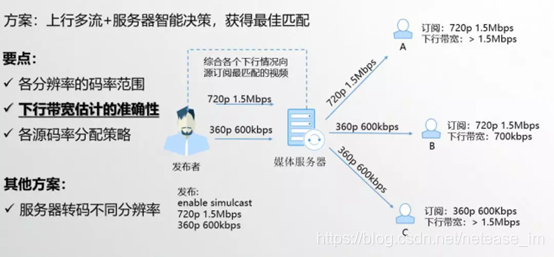我们知道每个参会用户对于不同人的清晰度需求是不同的,同时每个用户的网络的下行带宽是不同的。举个例子,发布者发布了最大能力是720p 1.5Mbps,用户A下行带宽大于1.5Mbps,他在界面上需要看发布者的大画面,所以他订阅720p 1.5Mbps;用户B的下行带宽只有700Kbps,他在界面上也需要看发布者的大画面,所以他也订阅的是720p 1.5Mbps;用户C的下行带宽 大于 1.5Mbps,但是他由于界面上只需要发布者的一个小画面,因此他只需要订阅发布者的360p 600Kbps。