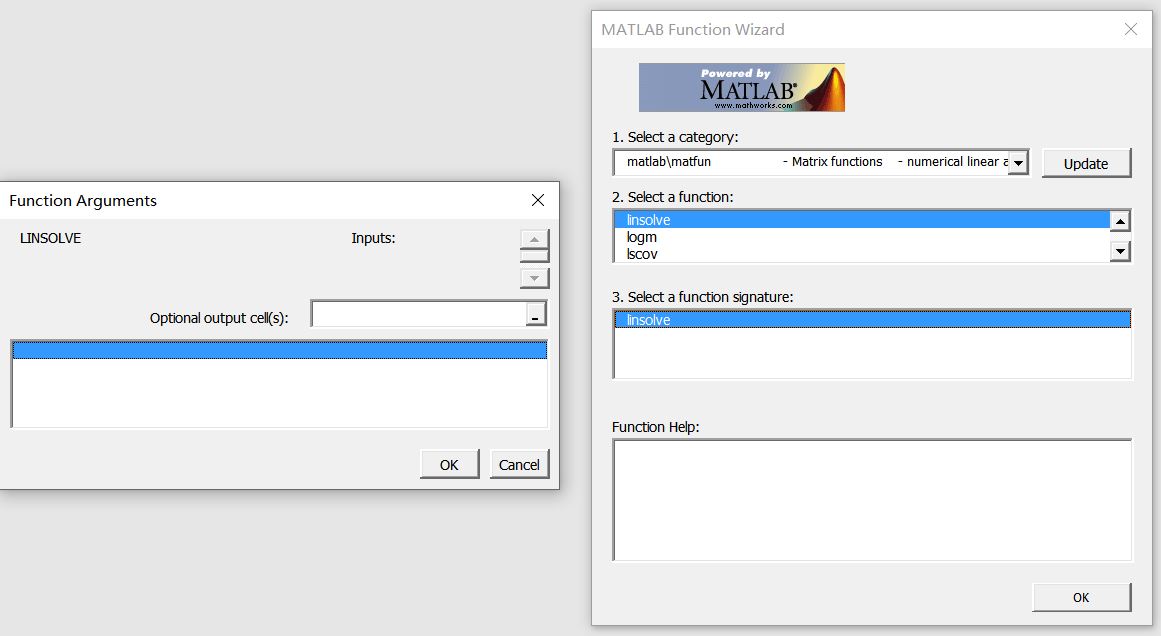 - 在Excel中选要放数据的表单,单击“MATLAB Function Wizard”,选择对应函数即可