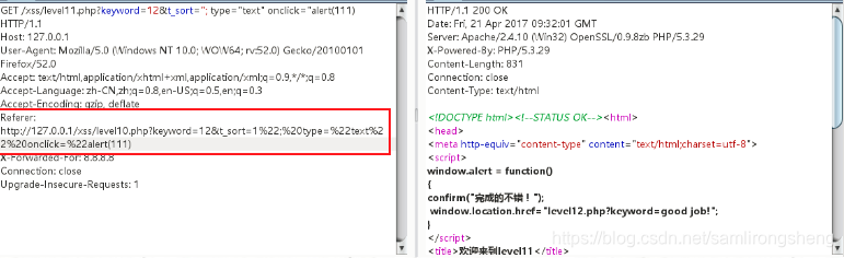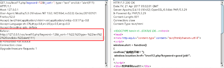 同样的过滤了<>,跟第十关一样,也可以自己构造Referer