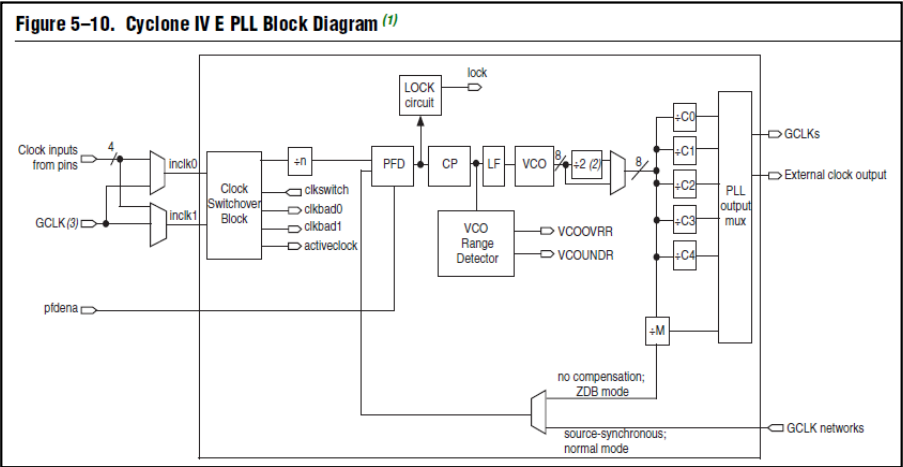 本次我们来学习FPGA的PLL,PLL(Phase Locked Loop)俗称锁相环,在很多的单片机中都有,它主要的目的是为了实现倍频和分频,因为我们系统运行的主频率是固定的,如果我们需要其他的频率,那么就需要超频或者降频,此时就需要锁相环实现。 FPGA的PLL是一个硬件模块,是十分重要的资源。本次博主使用的cyclone IV有四个PLL,为外部的端口提供高速的通信时钟。从数据手册中得到PLL的原理图如下