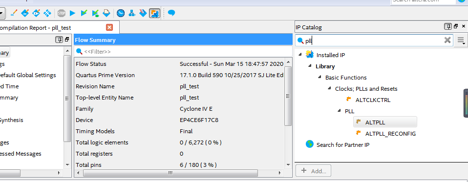 首先建立工程pll_test,然后我们需要进行pll的设置,点击IP catalog图标,即下图最右边的那个,搜索pll,点击ALTPLL后进行设置,起一个名字pll.v之后点击确定。