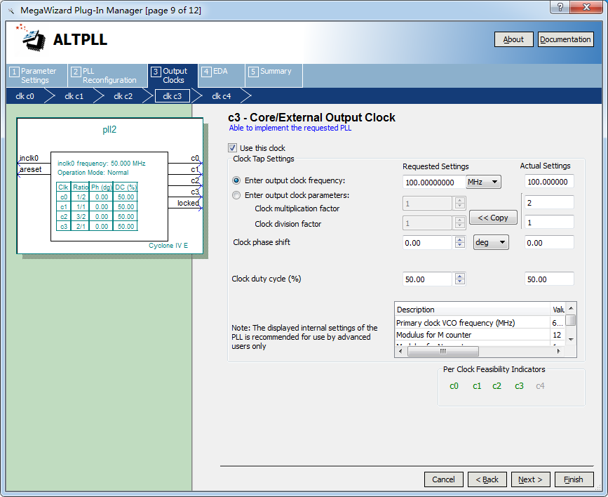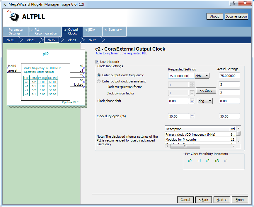在Output clocks中选择输出的时钟为25MHz, 使能时钟1,选择50MHz,时钟2选择时钟75MHz,时钟3选择100MHz,如下所示。