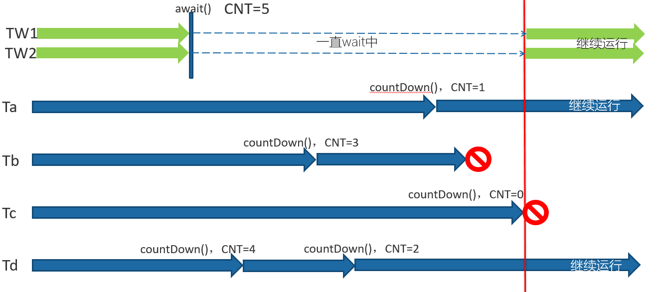 当计数器值到达 0 时,它表示所有的已 经完成了任务,然后在闭锁上等待 CountDownLatch.await()方法的线程就可以恢 复执行任务。