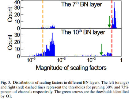 为了解决过剪枝和欠剪枝问题,网络层不同的分布也是一个预定义阈值的问题。拿VGG-14的第7和第10个bn层,重要权值的分组不是一致的;通过使用一个全局阈值,对于数值较小的scaling factors而言,属于一个灾难。例如作者想使用NS【14】剪枝73%,计算阈值很合适第7层BN层,但是对于第10层BN层而言就是过剪枝了。