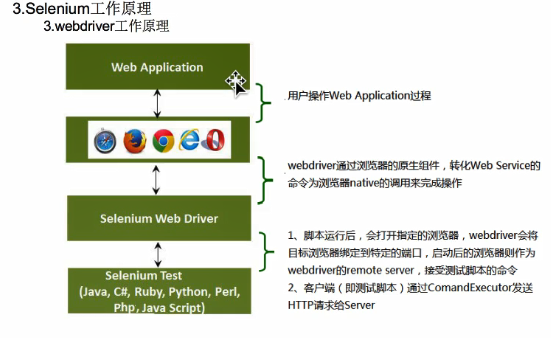 webDriver:前身是selenium RC(脚本需要开启服务再操作浏览器),直接发送命令给浏览器,脚本直接操作浏览器驱动,即可测试web应用了。可以测试手机应用程序:appium测试工具就是对这部分的再次封装,面向对象的api