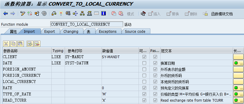 汇率维护在ERP中可以使用事务代码OB07或者OB08,每次不同币别的汇率更改在正式生产系统中都会新创建一条记录,保存之后会存储在表TCURR中,可以通过函数CONVERT_TO_LOCAL_CURRENCY转换获取(注意函数Exporting中各个参数一定不能用常量,要用变量),函数自动会把当前最近的时间的汇率作为转化的汇率。