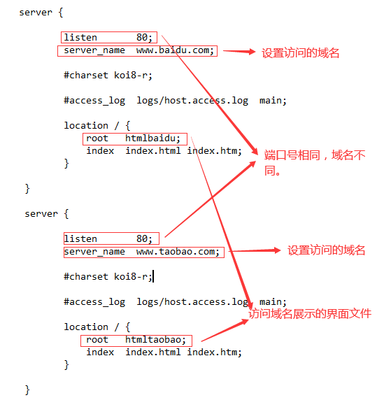 server_name 设置访问的地址,原本是localhost 现在该为www.baidu.com ,通过浏览器输入www.baidu.com之后就会去