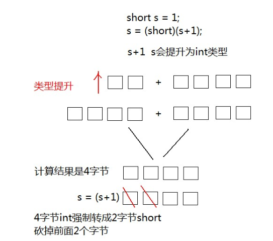 同样道理,当一个 short 类型与 1 相加,我们知道会类型提升,但是还想给结果赋值给short类型变量,就需要强制转换。
