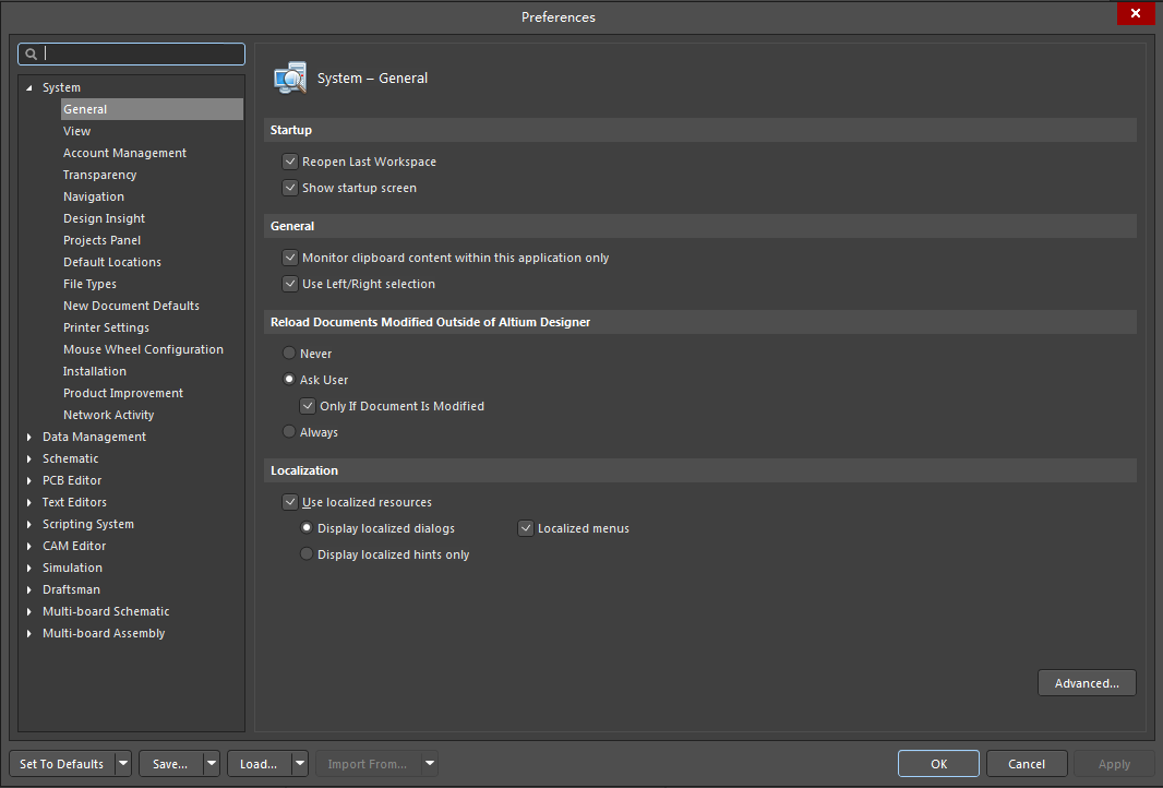 System–General是Altium Designer 18中“Preferences”对话框第一项功能的第一个页面,如下图所示。