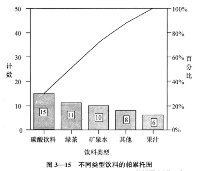 该图是按各类别数据出现的频数多少排序后绘制的条形图。图中左侧的纵轴给出了计数值,即频数.右侧的纵轴给了累积百分比。