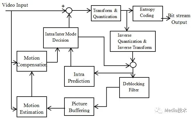 首先来看一下H.264的编码流程图,如上图所示其编解码流程主要包括5个部分:Intra/Inter 预测、变换(Transform)和反变换、量化(Quantization)和反量化、环路滤波(Loop Filter)、熵编码(Entropy Coding)。