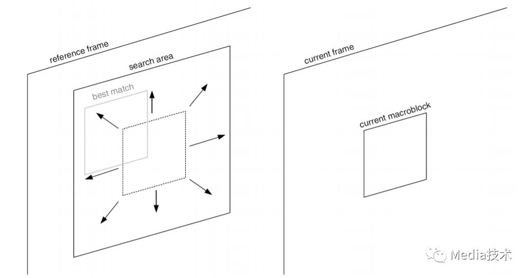 H.264提供了多种运动估计算法,在实际应用中要结合RD性能以及复杂度来选择出最佳算法。下图是ME过程的简单说明。当前帧的块在参考帧中的search area内找到最佳匹配块。