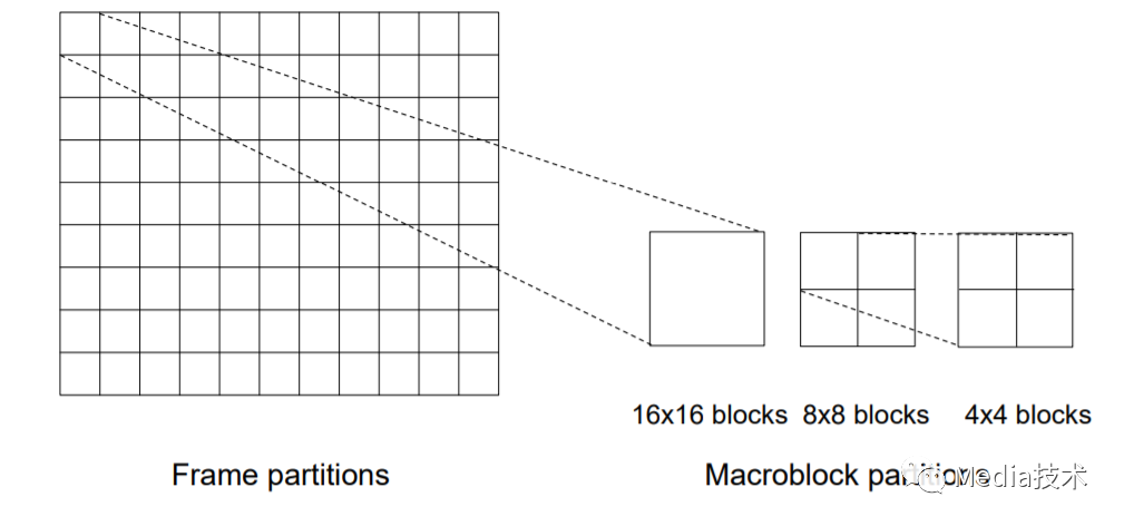 每一帧图像被划分成16x16。称为MB,再基于MB划分成更小的块,如8x8或者4x4。