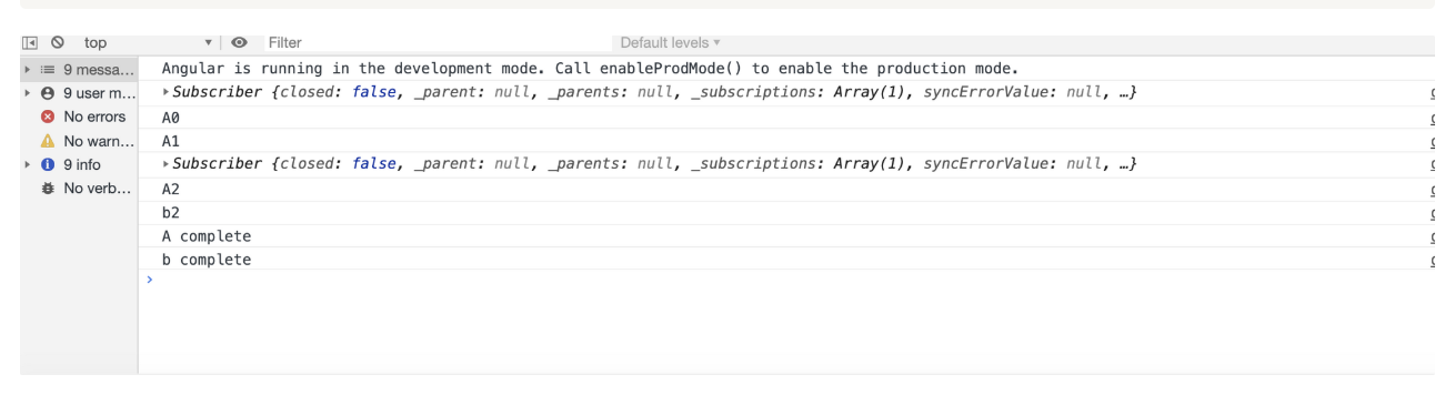 - AsyncSubject: 会在subject 结束后发送出最后一个值;如下面这个例子,AsyncSubject 用得比较少;