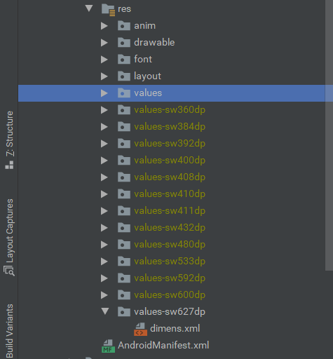 values资源文件夹是原始资源文件夹。所有values-sw***dp文件夹都是依赖 values目录下的dimens.xml 生成的。