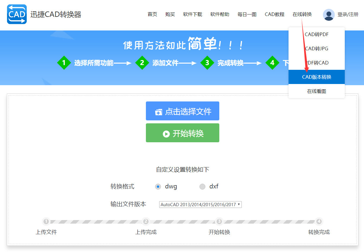 当我们准备好任意版本的cad文件后打开在线转换工具,发现导航栏分为七个大类,而我们选择在线转换列下的cad版本转换选项即可。