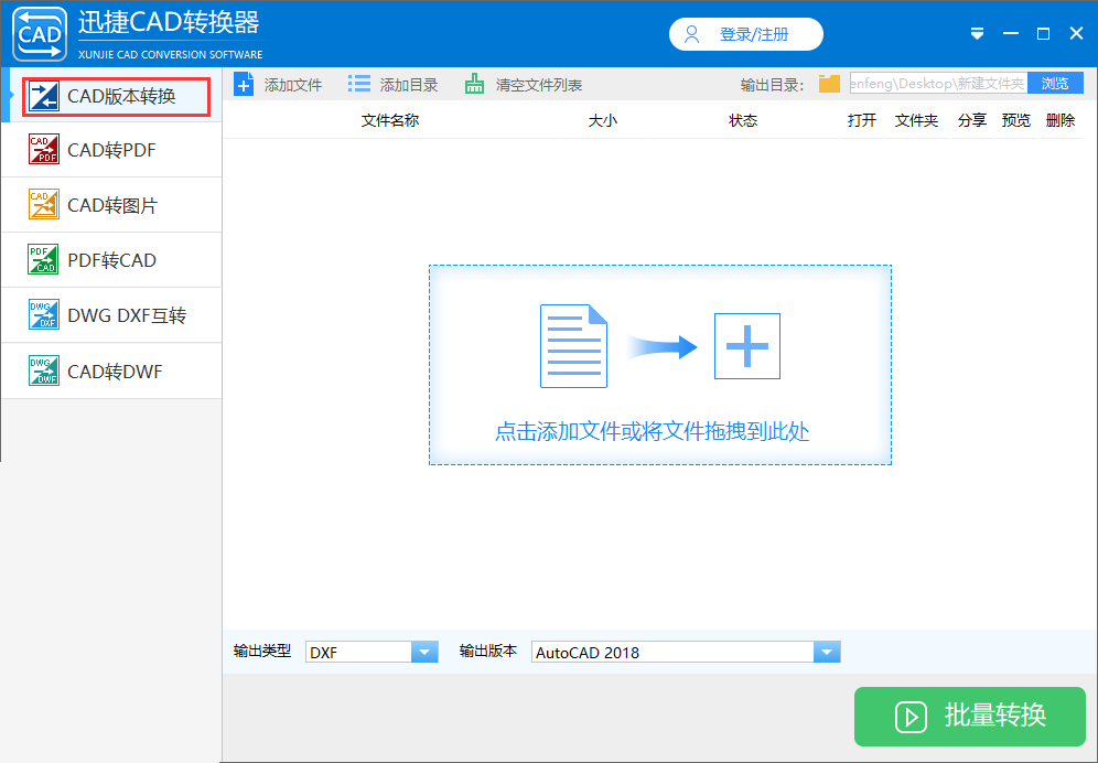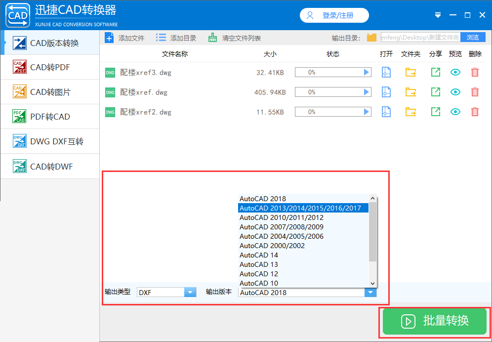 之后在输出类型和输出版本中把参数修改为自己想要转换的版本,接着点击批量转换选项就可以转换cad版本了。