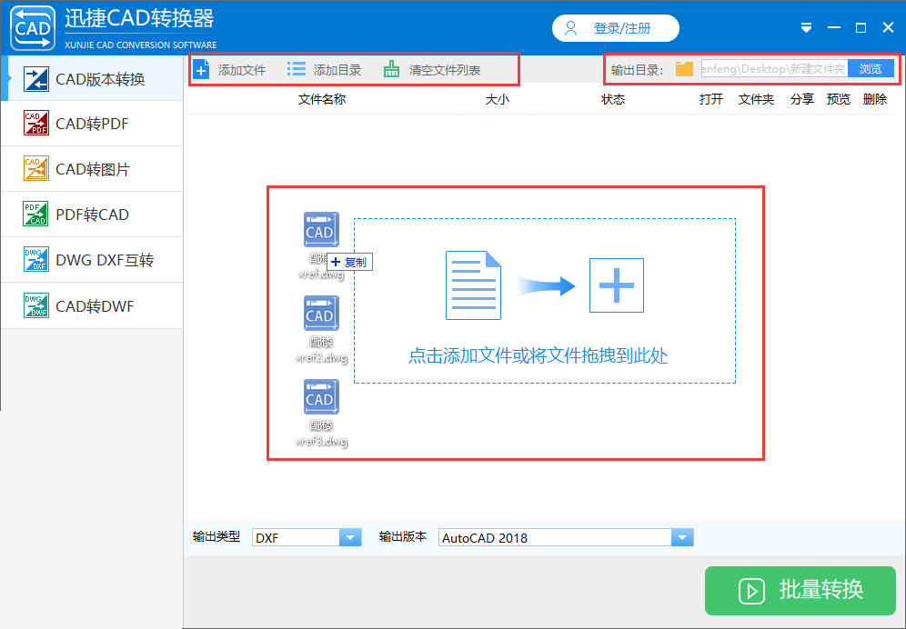 然后把cad文件批量添加到cad版本转换器中,添加的方式有很多种,选择任意一种添加方式即可。与此同时还可以在输出目录中自定义cad转换后文件保存到电脑的路径。