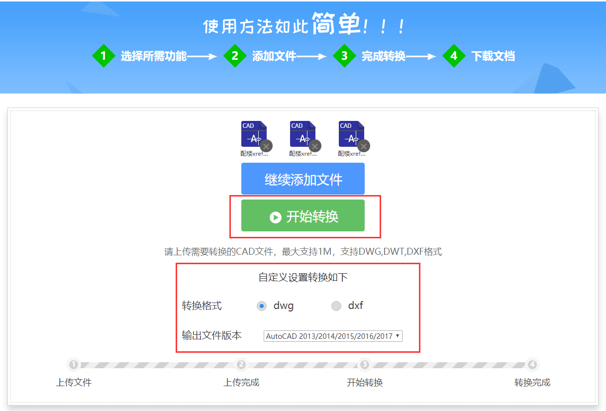 需要转换的文件都添加好后在下方自定义好转换格式和输出文件版本,而后点击正中的开始转换选项,在线cad版本转换器就会把添加的多个cad文件依据自定义版本参数进行转换。