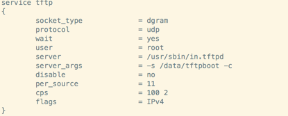 vim /etc/xinetd.d/tftp文件,将其中的disable=yes改为disable=no。开启TFTP服务