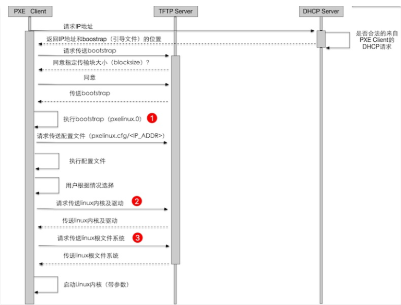 如下图,PXE client是需要安装Linux的计算机,TFTP Server和DHCP Server一般运行在一台Linux Server上。也可通过DHCP配置文件的next-server选项指定其他机器。Bootstrap文件、配置文件、Linux内核以及Linux根文件系统都放置在TFTP服务器的根目录下。