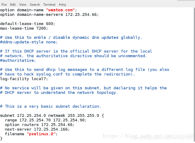 vim /etc/dhcp/dhcpd.conf #主要是配置filename和next-server