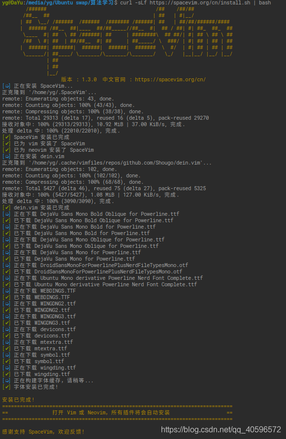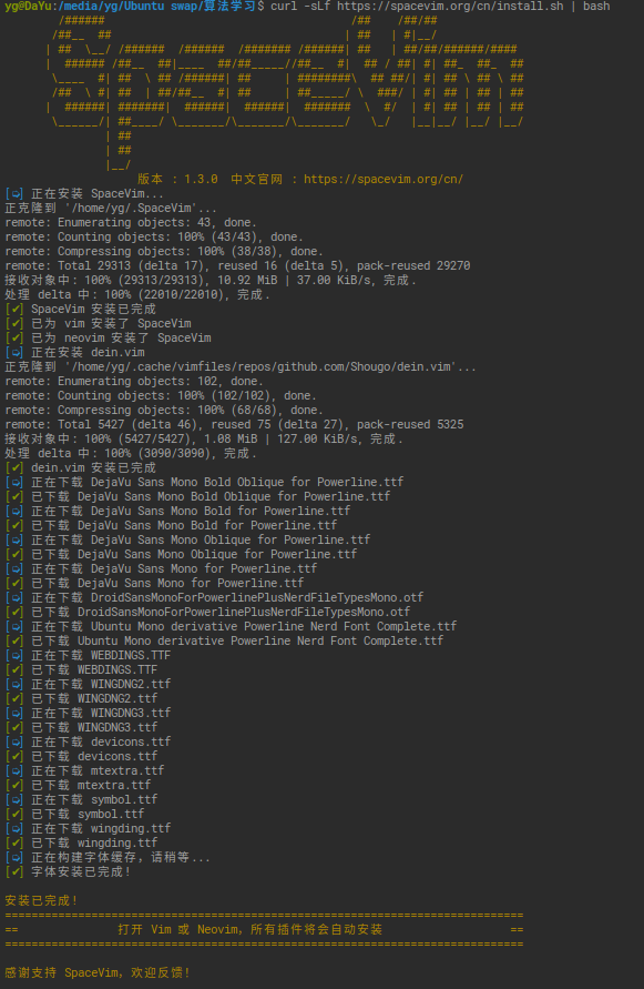 curl -sLf https://spacevim.org/cn/install.sh | bash,安装完成如图所示: