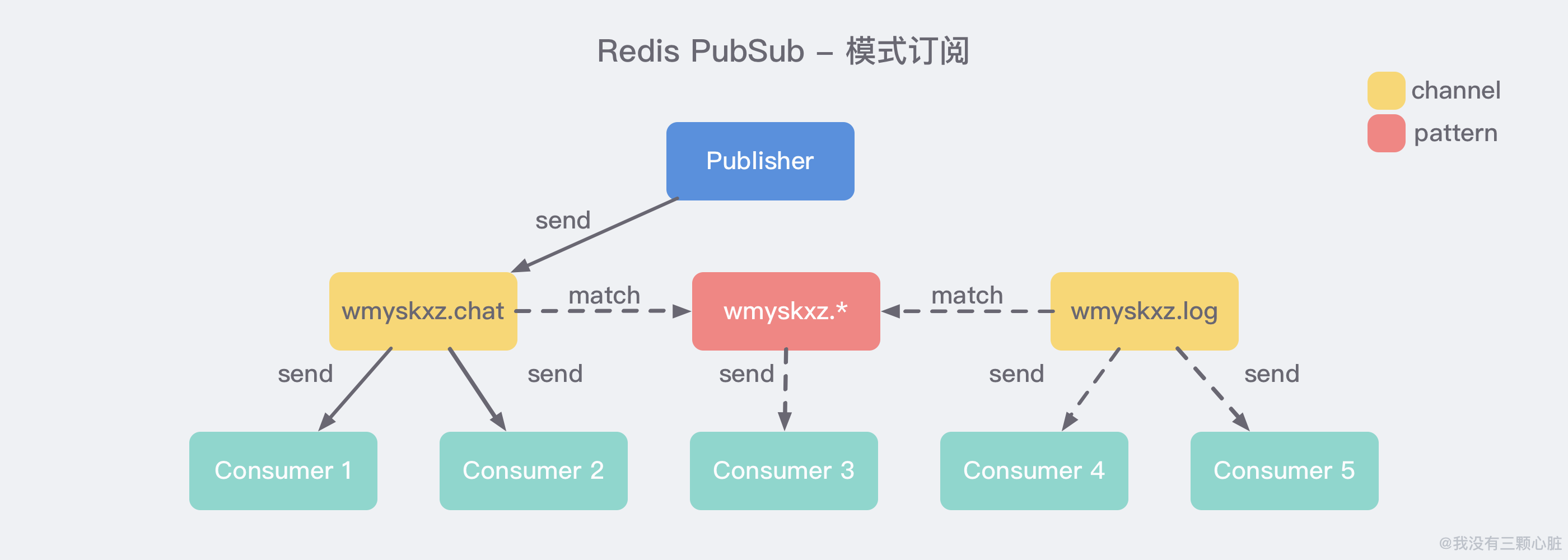 Publisher 往 wmyskxz.chat 这个 channel 中发送了一条消息,不仅仅关注了这个频道的 Consumer 1 和 Consumer 2 能够受到消息,图片中的两个 channel 都和模式 wmyskxz.* 匹配,所以 Redis 此时会同样发送消息给订阅了 wmyskxz.* 这个模式的 Consumer 3 和关注了在这个模式下的另一个频道 wmyskxz.log 下的 Consumer 4 和 Consumer 5。